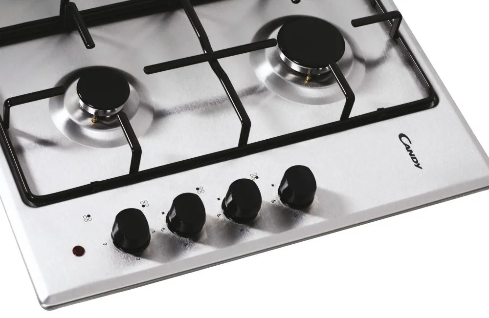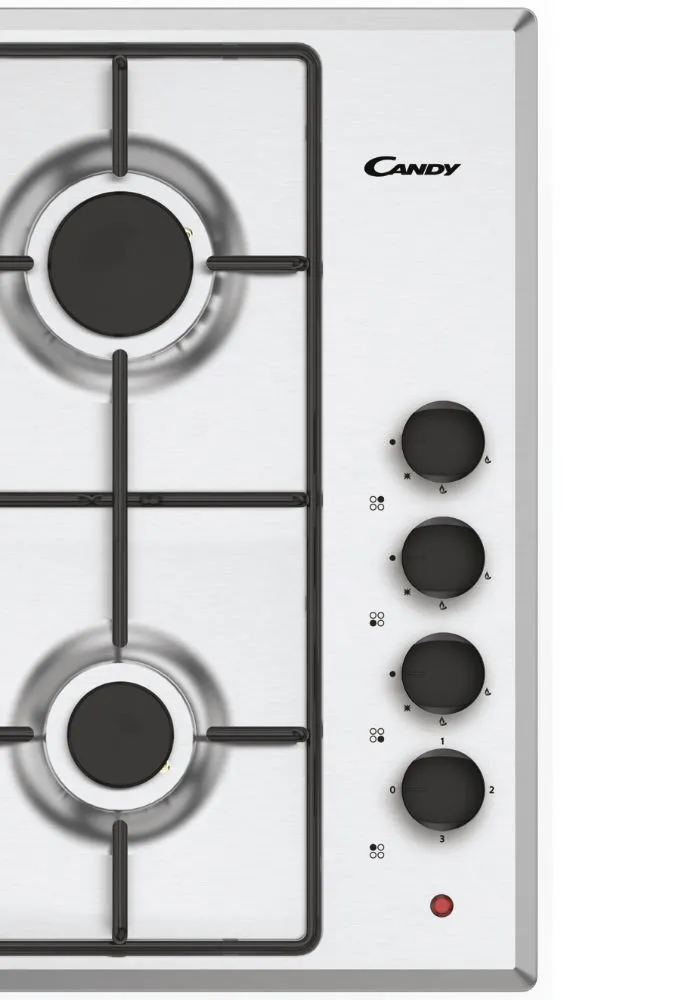 Candy kombinirana kuhalna plošča CMGH  31 X  v inox barvi, s tremi plinskimi in enim električnim kuhališčem. Za varnost poskrbijo elektromagnetna varovala za vsak gorilnik posebej. Upravljanje je mehansko z gumbi, ki so nameščeni na desni strani plošče.